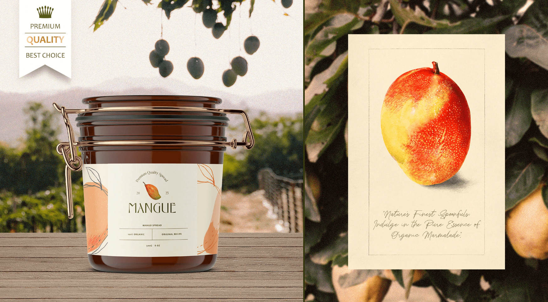 The main challenge for the brand packaging was to create an elegant and eye-catching label design for MANGUE's marmalade glass jar. The design needed to highlight the premium quality of the product with gold details while showcasing the mango flavor through appealing illustrations. The packaging had to stand out on the shelves, convey the brand's luxurious yet natural essence, and ensure functionality and user-friendliness.