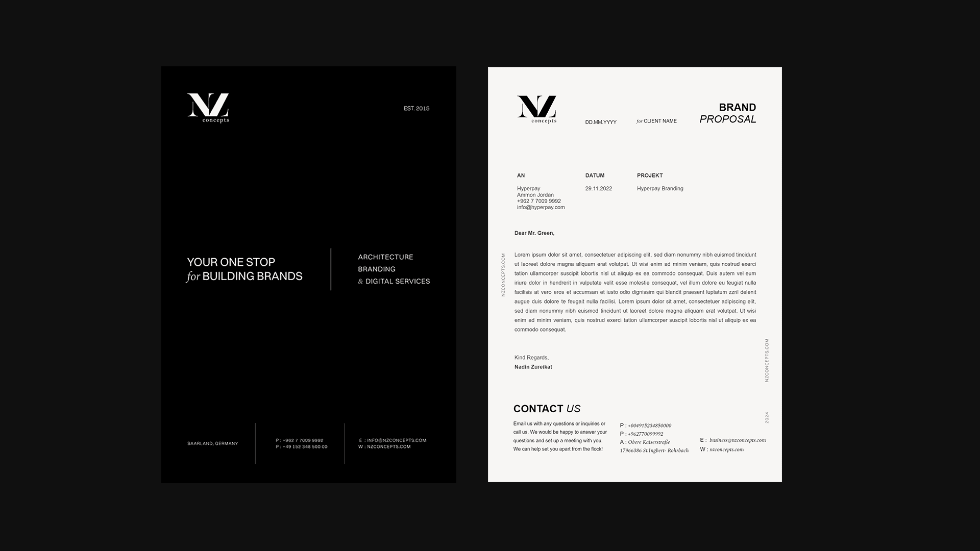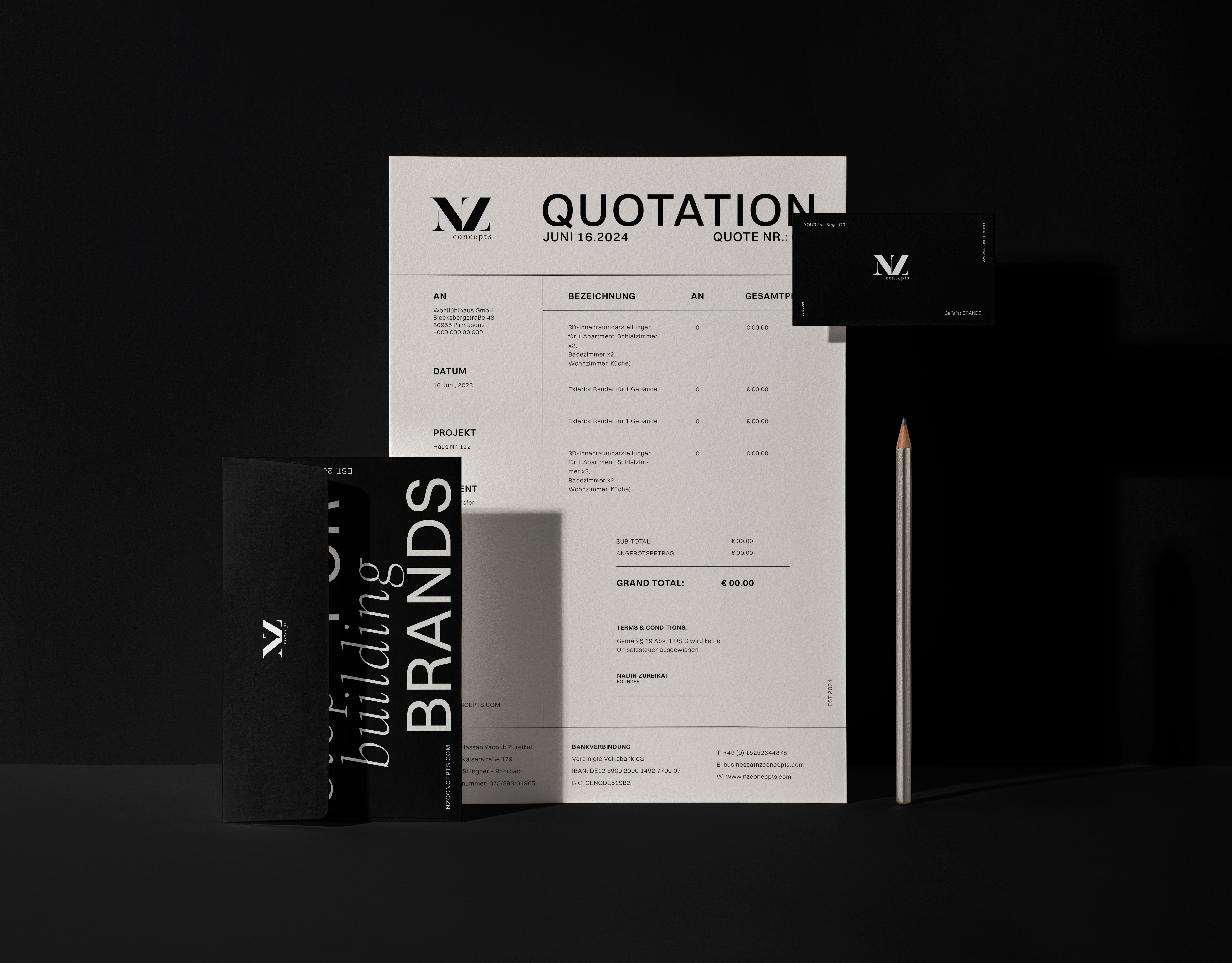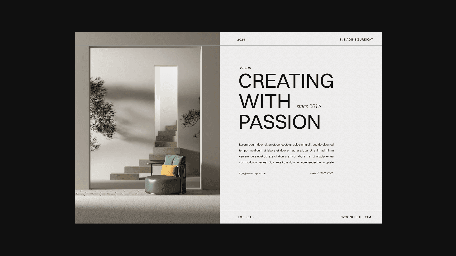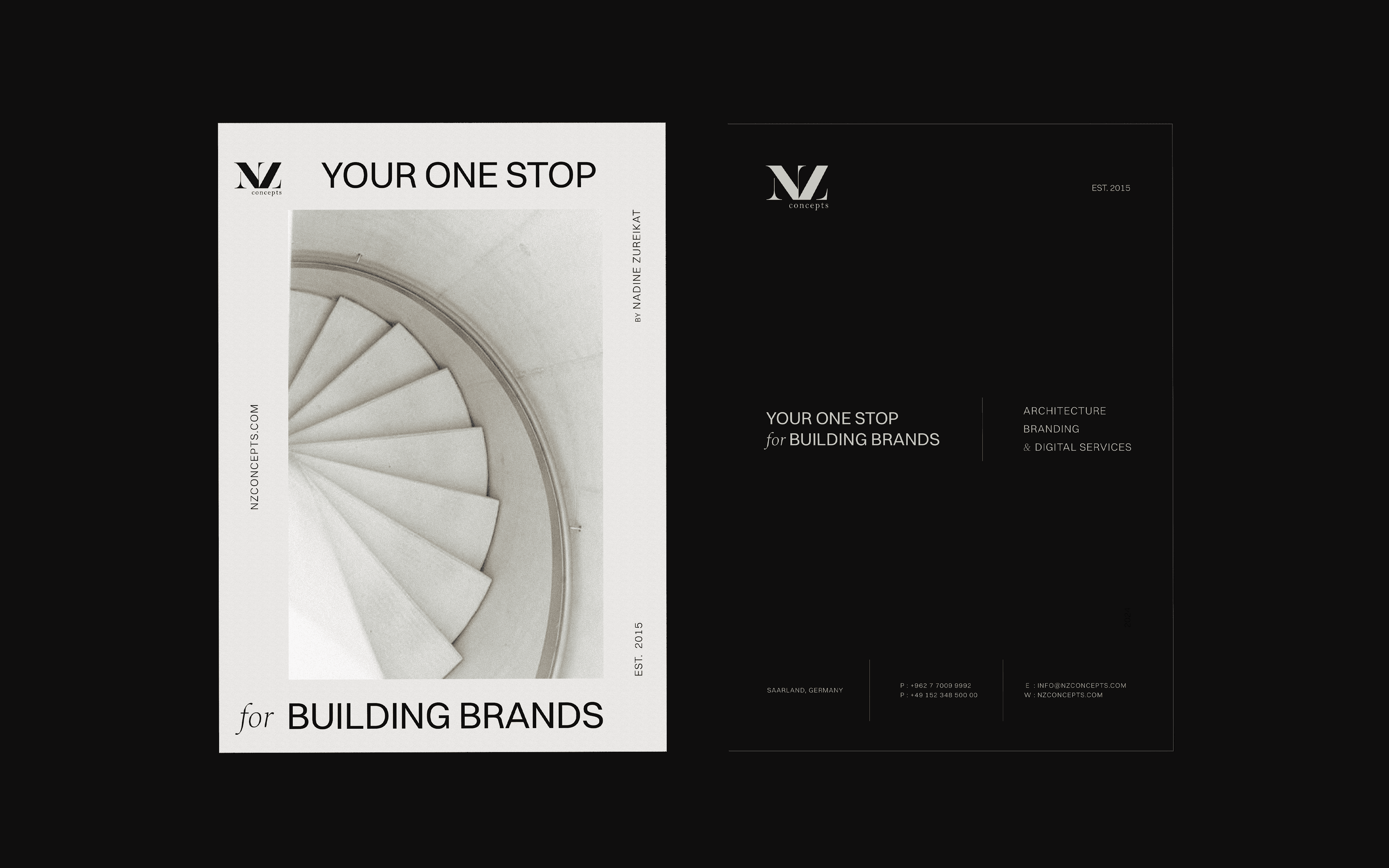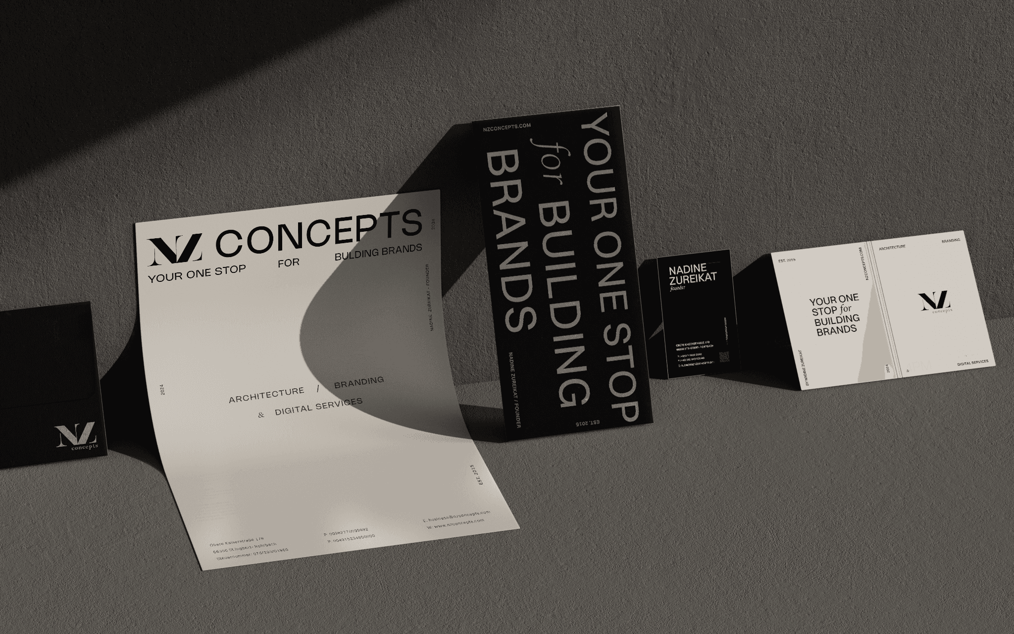 NZ Concepts is a marketing agency focused on architecture, branding, and digital services. The logo was already in place. The project was a focused redesign of their print and marketing materials to better reflect the clean, architectural character of their work. The approach drew from Swiss-style design principles, combining geometric and serif typography to balance boldness with precision. Neutral colors kept the system flexible and professional across applications.